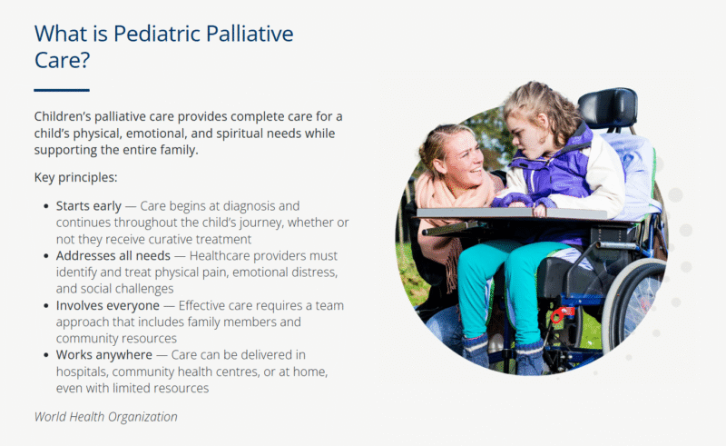 Children’s palliative care provides complete care for a child’s physical, emotional, and spiritual needs while supporting the entire family. Key principles according to World Health Organization: