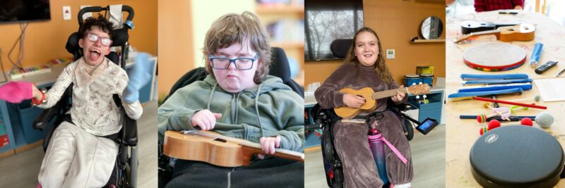 When the Emily’s House music therapist would visit, she showed up for the child – for the child’s enjoyment, therapeutic self-expression, and delight through music. The child took a great interest in exploring the treasure chest of travelling instruments the Emily’s House music therapist brought to their in-home sessions. Given her limited mobility and autonomy, the opportunity to choose an instrument from the treasure chest was always a thrill for this child. Her favourite instrument from the musical treasure chest was the ukulele! During their earliest music therapy sessions, she chose to play the ukulele while the music therapist played guitar.